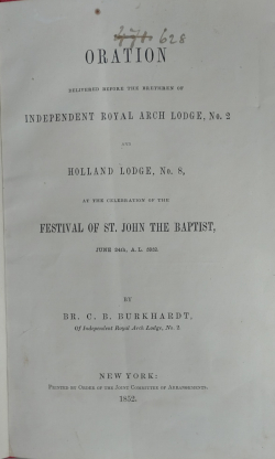 Address - Oration delivered before the Brethren of Independent Royal Arch Lodge No. 2 and Holland Lodge No. 8 at the celebration of the Festival of St John the Baptist June 24th, 1852