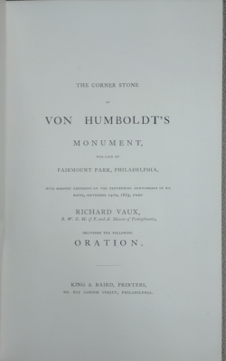 Oration delivered at the Laying of the Corner-Stone of Von Humboldt's Monument, Fairmount Park, Philadelphia